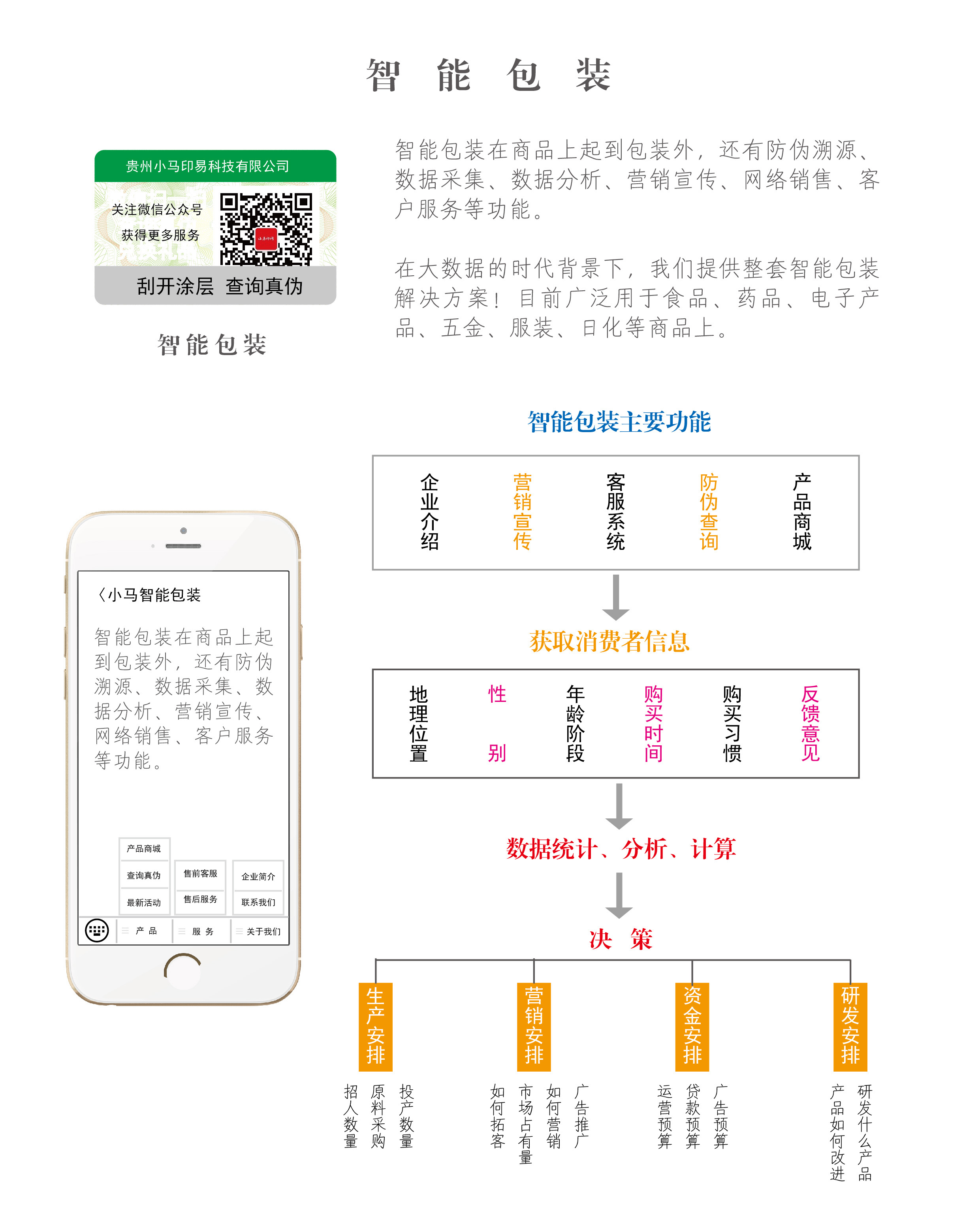 通过云计算、移动互联网、物联网等技术,在产品包装上使用二维码、AR增强现实(图像识别)、隐形水印、数字水印、点阵技术、RFID电子标签等技术,对产品全生命周期的信息进行采集,进而构建智慧物联大数据平台,实现产品防伪、追溯、移动营销、品牌宣传等功能,增强消费者的体验感,规避营销渠道违规销售行为,提升企业的品牌宣传力度。同时开拓新的商业模式,并逐步减少对传统商业模式的依赖。